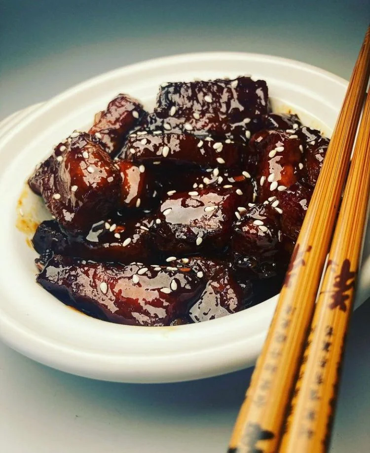 Slow cooked Pork Belly, Kung Pao Sauce, Black Rice & Gomodare Salad
